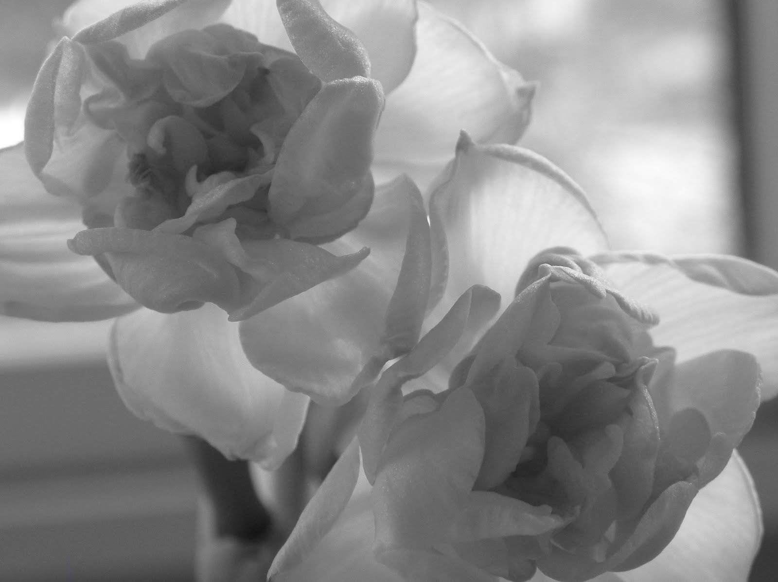 These are some Narcissus flowers that were in a pot on my grandparents' porch over the weekend. In color they're white and buttery yellow and very pretty. There's just something about them in black & white that I love though. The way the petals look so transparent with the light hitting them. I also just like the general shape and curve of the petals on their own.